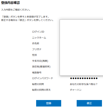 本登録の情報(お名前,フリガナ,性別,生年月日,居住地,電話番号,ログインID,ログインパスワード,秘密の質問,の答え,ニックネーム,謎の文字列)を入力し確認