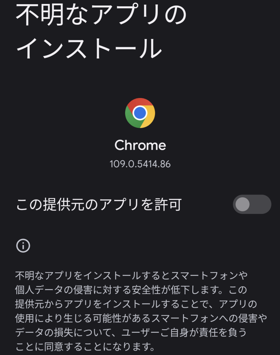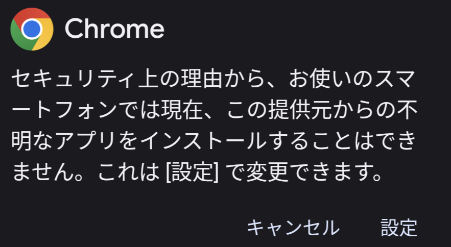 DLが終わったらAndroidの設定→アプリ→Chrome→不明なアプリのインストール→OFFに戻す